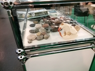 | Biberschädel vor lechkieseln | Gotlind hat Dienst am Stand |